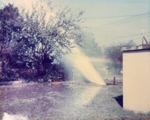 A few minutes later, I emerged from the building and froze. A massive roar filled the air, and where the drill rig had been, there was thick, powerful geyser blasting 100 feet into the air. Stupefied, I walked back to connect with the drillers. Cold spray fell like rain, soaking everything within a fifty-yard radius. A crowd of neighbors had gathered, and trucks with yellow flashing lights were careening down the road.